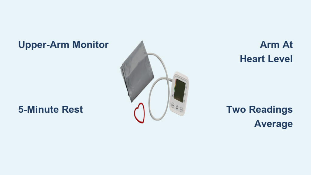 Sit quietly for a full 5 minutes before pressing start—this isn’t optional. Set a timer and resist the urge to check your phone or finish household tasks. This rest period allows your circulatory system to stabilize after movement, preventing falsely elevated readings from recent activity. Rushing this step causes the most common home measurement error, so build this mandatory pause into your routine like brushing your teeth.