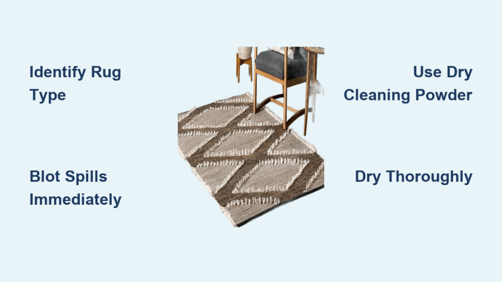Perfect for silk, antique, or moisture-sensitive rugs, dry cleaning powder absorbs oils and dirt without water. Sprinkle 2-3 ounces per 10 square feet, then use a soft brush to work the powder into fibers. Let it sit for 30 minutes (up to 2 hours for heavily soiled areas), then vacuum repeatedly using different directions to remove all residue. This method safely cleans rugs that would be ruined by water exposure.