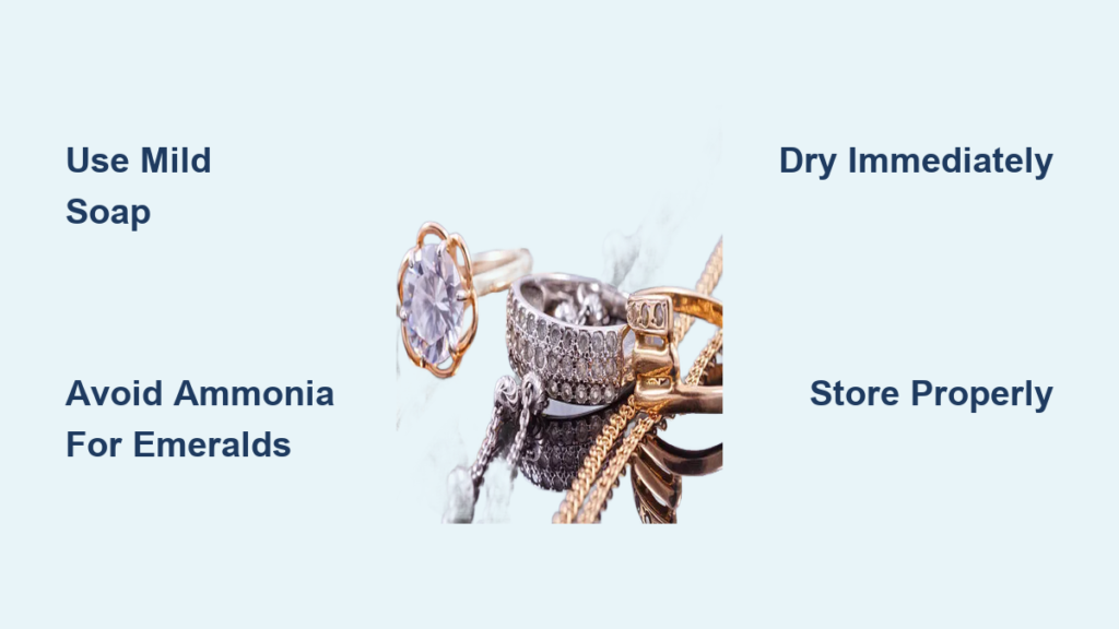 Emeralds: Use only mild soap and water—no ammonia, ultrasonic, or steam. These stones often contain fracture fillings that chemicals can damage. Clean gently and dry immediately.