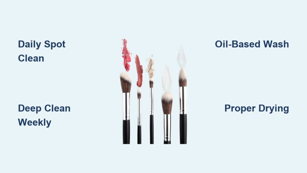 Duo-fiber brushes: Clean with minimal pressure to prevent fiber separation—use only baby shampoo. Dense foundation brushes: Pre-soak 5 minutes in oil solution before washing. Precision liners: Clean individually with micro-swirls to maintain sharp tips. Always reshape immediately after rinsing.