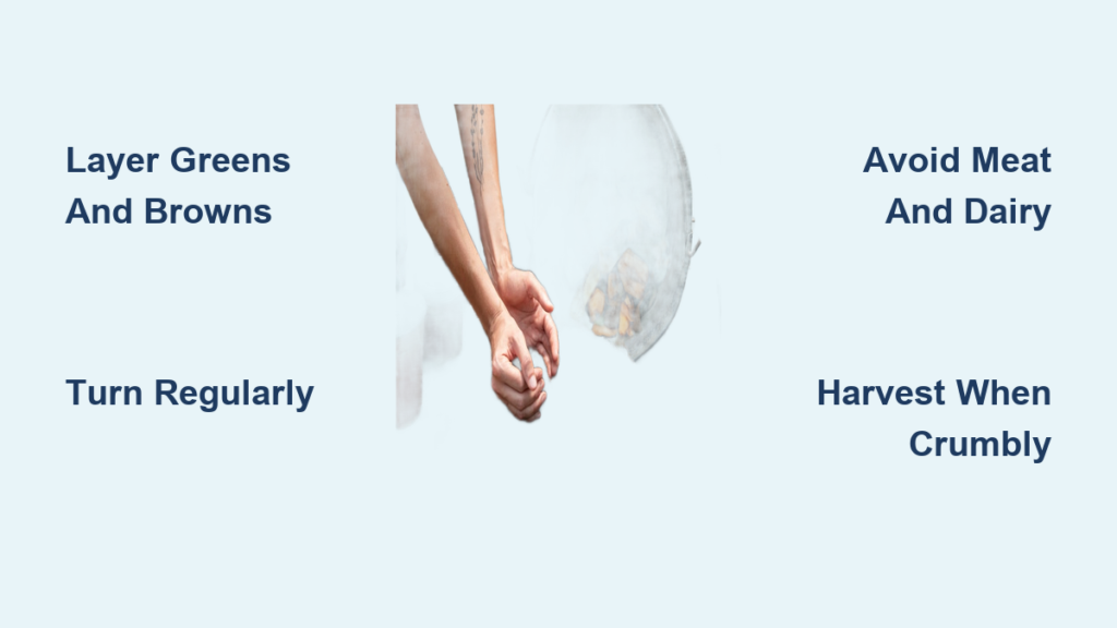 Start with a 4-inch base of twigs for drainage—this prevents soggy bottoms. Alternate 2-inch layers: browns (leaves), greens (scrapes), then browns again. Top with a 3-inch “browns blanket” to deter flies. Moisten each layer until damp as a wrung-out sponge—too wet causes rot, too dry stalls decomposition. Space-saving hack: On concrete patios, lay hardware cloth first, then add wood chips before your twig layer to aid drainage and earthworm access.