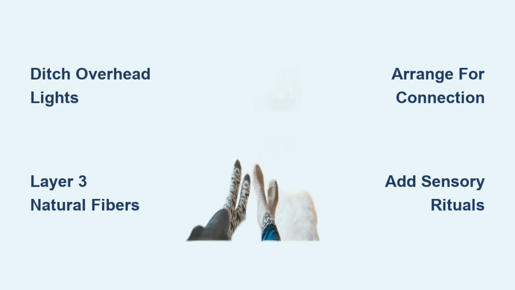Swap every bulb >4000K for 2700K LEDs ($12 at hardware store). Add one rechargeable wall sconce ($15 at Target) behind your main seating. At night, turn off overheads—rely solely on your new layered lighting. Notice how shadows soften sharp edges? That’s cozy activating.