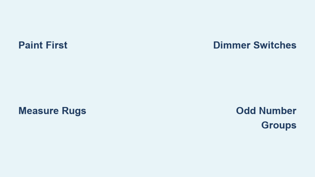 Harsh overhead lighting ruins any space. Every room needs three layers: ambient (recessed cans), task (reading lamps), and accent (picture lights). Install dimmer switches in all main areas—this $15 DIY swap transforms movie nights and dinner parties. Most basic switches swap easily with no electrician needed. Without dimmers, you’ll constantly battle “too bright” or “too dim” lighting—killing the mood before you even add decor.