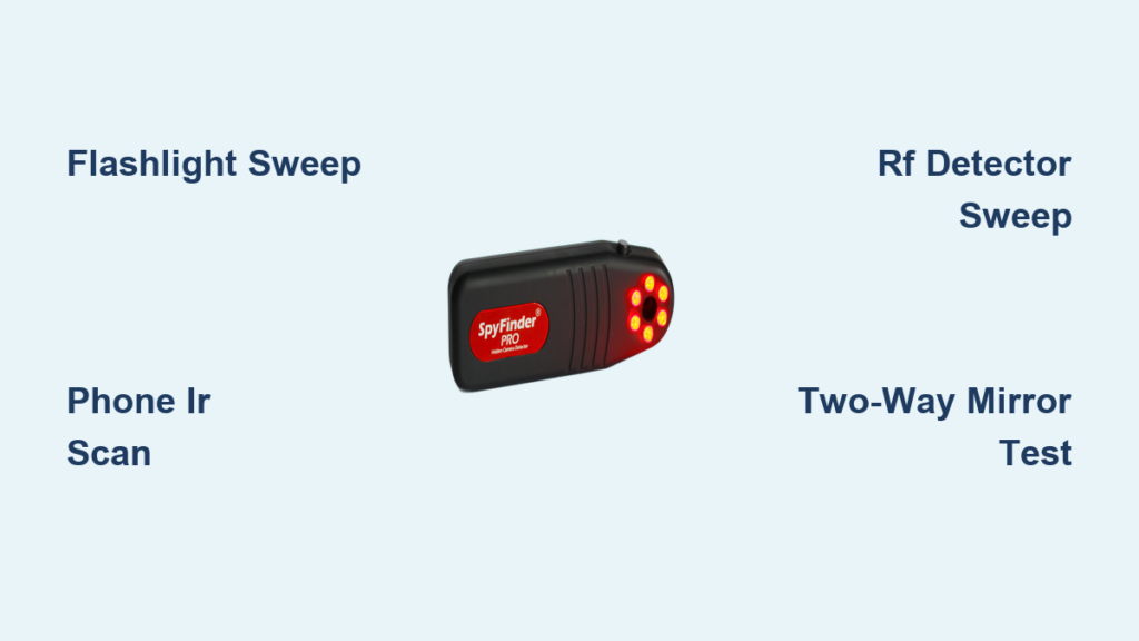 Critical limitations: This method won’t work with rear cameras, gives false positives from TV remotes, and misses cameras without night vision. Always combine this with other detection techniques for comprehensive coverage.