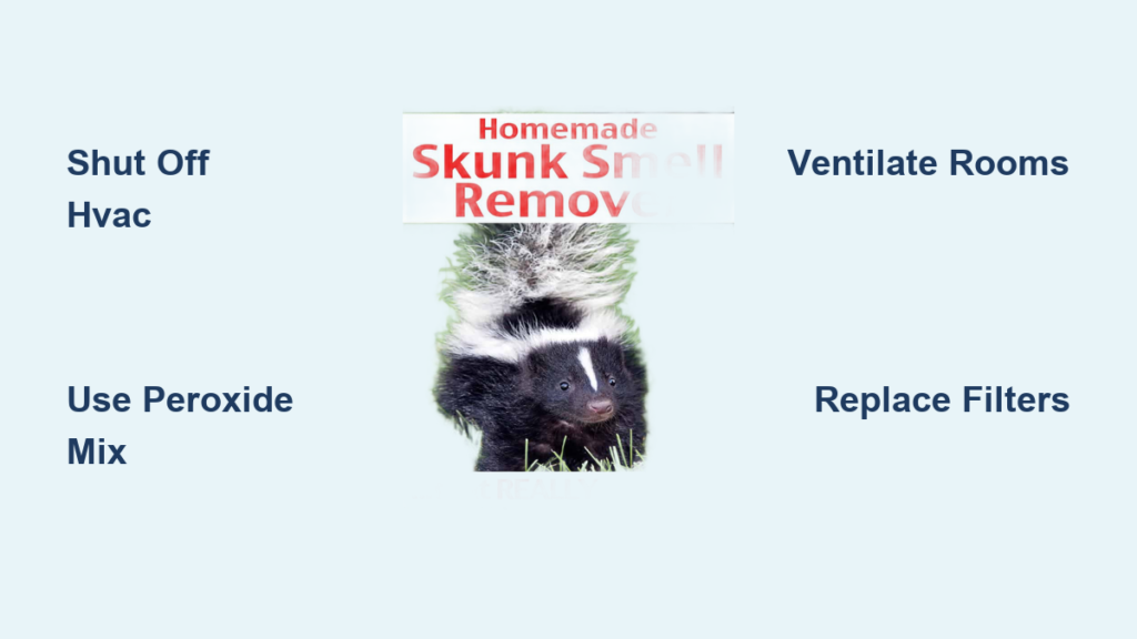 Shut down your HVAC immediately—this is your single most important action. Skunk molecules travel through ducts within minutes, contaminating every room. Turn off the system and replace filters before anything else. Simultaneously, open every window and exterior door to create cross-ventilation. Work fast: the first hour determines whether you’ll need professional help later.