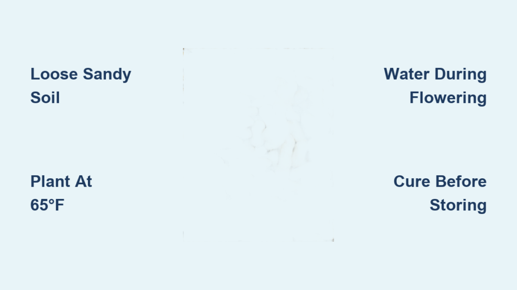 Plant seeds 1.5-2 inches deep once soil consistently reaches 65°F. Space Spanish types 8 inches apart in rows 24 inches apart; Virginia types need 18 inches in rows 36 inches apart. Critical timing: Cold soil below 60°F causes rot. Use a soil thermometer—don’t guess.