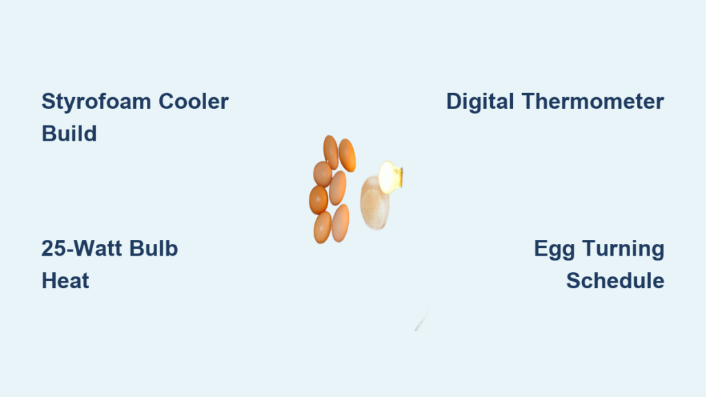 Cut a 1-inch circular hole in one end of your styrofoam cooler using a sharp knife. Push the lamp socket through from both sides, leaving the bulb inside the chamber. Secure both sides with multiple layers of duct tape—this prevents fire hazards and maintains insulation integrity. Critical warning: Never let the bulb touch styrofoam directly. The 25-watt bulb provides perfect heat without melting risks, while higher wattages could damage your incubator.