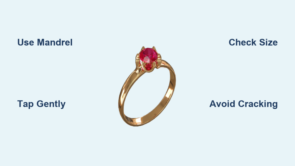 5. Check progress frequently – After 4-5 light taps, slide the ring up the mandrel to gauge expansion. The goal is gradual, even stretching—never exceed 2 full sizes as the metal becomes dangerously thin.