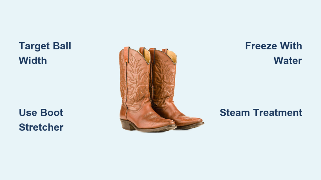 Most cowboy boot discomfort centers on the ball width—the widest part of your foot where leather stretches least naturally. When this area pinches, you’ll develop blisters with every step. Target this trouble spot by applying stretching solution directly to the interior leather across the ball area, then immediately wear thick socks with your boots for 30-45 minutes while flexing your feet.