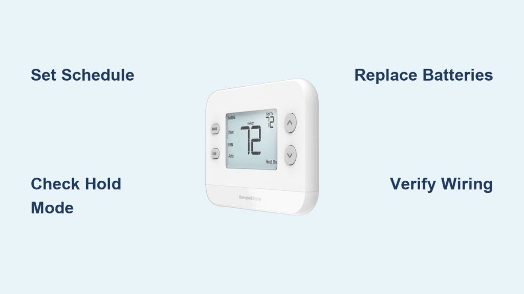 If temperatures don’t change as scheduled, 90% of cases involve accidental “Hold” activation. Press “Run” or “Cancel Hold” immediately—this single button resolves most “broken schedule” complaints. If the issue persists, reset by removing batteries for 30 seconds (backup power clears errors without erasing schedules).